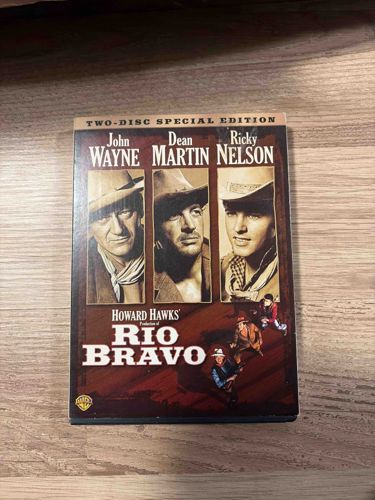 A physical media DVD set for Howard Hawks' classic 1959 Western film, 'Rio Bravo'. This specific version is a 'Two-Disc Special Edition' released by Warner Home Video, likely produced in the mid-2000s (circa 2007). The front cover features three distinct sepia-toned portraits of the film's lead stars: John Wayne, Dean Martin, and Ricky Nelson. Below the portraits is the film title in bold white lettering against a reddish-brown background depicting smaller action figures of the characters. The Warner Bros. logo is visible in the bottom-left corner. The item is housed in a standard clear or black plastic amaray case with a printed paper sleeve insert. The physical condition appears generally good, though there is visible light edge wear on the paper slipcover, particularly at the corners and the top edge. The surface shows minor micro-scratches consistent with household shelf storage. As a 'Special Edition', it includes a second disc dedicated to bonus features like documentaries and commentaries, which are indicators of higher production value for collectors compared to standard single-disc editions.