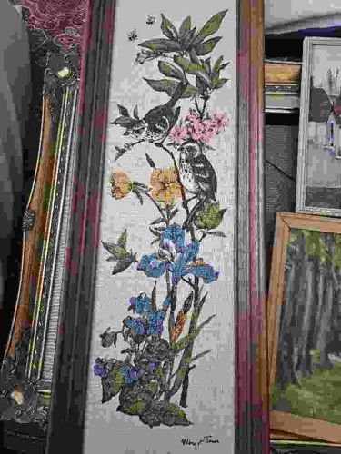 This item is a vertically oriented vintage needlepoint piece, likely worked in wool yarn on a canvas ground. The composition features a naturalistic scene of two songbirds perched among a variety of blossoms, including pink hydrangeas, yellow tulips, and blue irises at the base. Small insects, possibly bees, are shown flying above the foliage. The palette consists of muted earthy greens, browns, and blacks, contrasted with vibrant blues and soft pinks. The needlework is housed in a dark wood frame with reddish-brown undertones and a simple rectangular profile. From a condition standpoint, the textile shows some age-related toning of the background fabric, and the tension across the canvas appears slightly irregular. There are minor scuffs visible on the wooden frame edges. The embroidery demonstrates high-quality craftsmanship through detailed shading on the bird feathers and varied stitch textures to differentiate petals from leaves. Based on the style and subject matter, this piece likely dates from the late 1960s to mid-1970s, a period when botanical crewel and needlepoint kits were popular for home decor. A signature is visible in the lower right corner, though the resolution prevents a definitive identification of the maker's name.