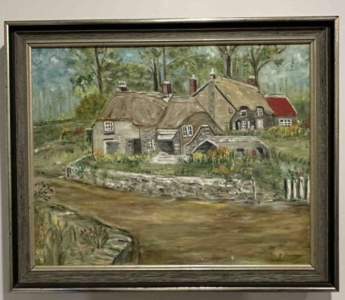 Folk Art Landscape Painting of Thatched Cottages by G. Sheldon