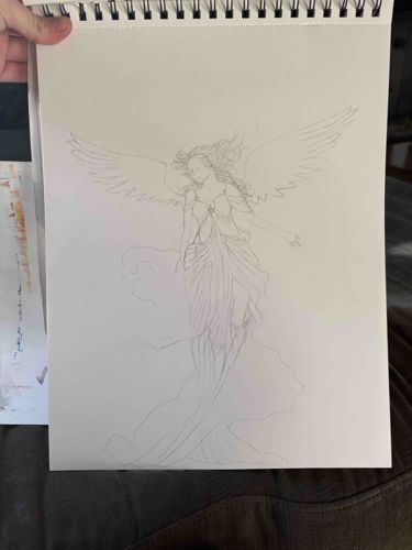 This item is an original, hand-drawn pencil sketch on white drawing paper, contained within a top-spiral-bound sketchbook. The artwork depicts a neoclassical, winged female figure, possibly an angel or a Personification of Victory (Nike), in a standing or floating pose. The figure is rendered with fine, delicate line work, showcasing intricate details in the flowing drapery of the gown and the individual feathers of the symmetrical, outstretched wings. The subject features long, wavy hair and a serene facial expression. Note the use of light graphite for the initial underdrawing, with more defined, confident strokes used for the final outlines. There is also a hint of light purple or bluish colored pencil utilized for shading and tonal depth in the lower sections of the dress. The paper appears to be a standard medium-weight sketch grade with a smooth finish. Current condition suggests an unfinished 'work in progress' state; there are no visible artist signatures, dates, or maker marks on the page. The overall style is contemporary leaning toward fantasy or classical illustration. The paper edges are clean and intact within the spiral binding, showing no significant yellowing, tearing, or smudging, indicating it is likely a modern creation.