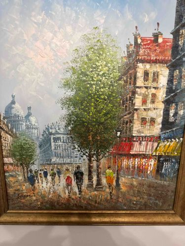 This is an original oil on canvas painting depicting a bustling Parisian street scene, likely Montmartre, given the prominent domes of the Sacré-Cœur Basilica visible in the background. The work is executed in a heavy impasto technique, where thick layers of lead-free oil paint are applied with a palette knife to create a rich, three-dimensional texture. This is particularly visible in the foliage of the central trees and the architectural details of the cafes featuring vibrant red and yellow awnings. The color palette is varied, utilizing muted grays and browns for the street and sky, contrasted sharply by the bright primary colors of the pedestrians' clothing and the storefronts. The painting is signed in the lower left corner, appearing to read 'Burnett,' indicating it is likely a mid-to-late 20th-century work produced in the popular 'Paris School' style typical of Caroline Burnett or her contemporaries. The piece is housed in a molded gilt wood frame with a slight distressed finish. Condition-wise, the canvas appears taut with no visible punctures or significant paint loss; however, there is a natural aged patina and minor dust accumulation within the impasto crevices. The frame shows slight wear on the corners but remains structurally sound. This style of painting was widely produced for the tourist and decorative market between the 1950s and 1970s, characterized by its energetic brushwork and romanticized urban subject matter.