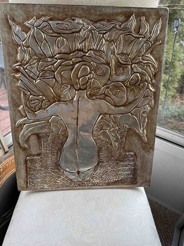 Repoussé Metal Relief Plaque of Female Nude with Calla Lilies