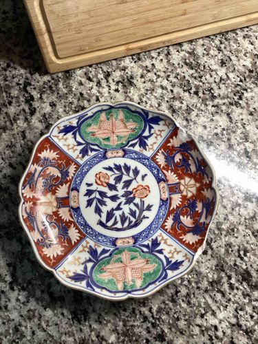 This is a decorative ceramic plate crafted in the iconic Japanese Imari style, likely dating from the Meiji period (late 19th century) or early 20th century. The piece features a traditional lobed or scalloped rim, which is a common characteristic of Edo and Meiji export porcelain. The design is executed in a palette of underglaze cobalt blue, complemented by overglaze iron-red and green enamels with touches of gilding. The central roundel (medallion) depicts a floral arrangement with stylized peonies and cobalt leafy branches. Radiating from this center are alternating panels; two panels feature green-ground cartouches containing a four-directional floral motif, while the other two panels exhibit more dense floral arabesques against a rust-red background. The craftsmanship shows typical high-quality hand-painted details synonymous with Arita kilns. Regarding condition, there is a prominent chip visible on the right-hand edge of the scalloped rim, which has broken through the ceramic body. Additionally, there appears to be some minor rubbing to the gilt highlights and light surface scratches consistent with the item's age and previous handling. There are no visible maker's marks from this angle, though such pieces often contain marks on the underside or are left unmarked when intended for the export market.