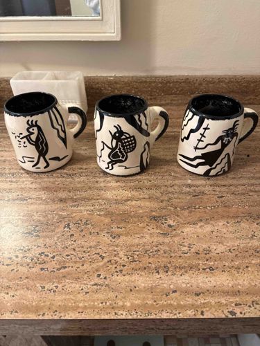 Set of Three Handmade Kokopelli Motif Ceramic Mugs