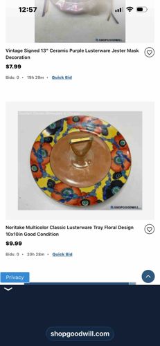 This item is a circular Noritake lusterware tray, measuring approximately 10 by 10 inches. The piece features a vibrant, multi-colored Art Deco-inspired floral design on the outer rim, characterized by bold orange poppy-like flowers and smaller blue and green circular motifs set against a striking yellow background. The center of the tray possesses a contrasting solid tan or copper-toned iridescent luster finish. A distinctive integrated handle rises from the center, finished in the same copper tone, which provides both utility for serving and a sculptural element to the design. The construction is ceramic with a high-gloss glazed finish across the entire surface. While the listing notes 'Good Condition,' typical lusterware of this age often shows light surface scratches or minor rubbing to the delicate metallic overglaze. This piece reflects the craftsmanship of Japanese ceramics from the early 20th century, specifically the 1920s to 1930s, known as the 'Made in Japan' era. The quality is indicated by the precision of the hand-painted floral borders and the characteristic sheen of the luster glaze, which creates a pearlescent effect when it catches the light.