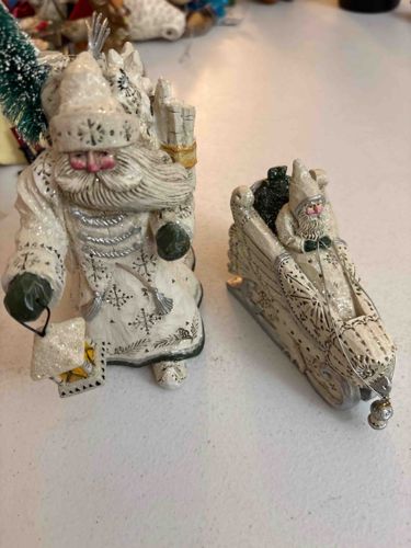 This set consists of two handcrafted folk art figures, likely from the Jim Shore Heartwood Creek 'White Woodland' collection. The primary figure is a standing Father Christmas/Santa Claus character, approximately 8-10 inches tall, crafted from cast resin with a hand-painted finish that mimics the look of carved wood. The figure features a monochromatic winter palette of creams, whites, and greys, accented with a subtle iridescent glitter coating to simulate fresh snow. Santa is depicted with a long, flowing white beard, wearing a heavy winter robe adorned with intricate bas-relief quilt patterns, birch bark textures, and snowflake motifs. He holds a lantern in his right hand and carries a pack with a pine tree on his back. The secondary piece is a matching sleigh featuring a smaller Santa figure nestled within, echoing the same 'Russian' or 'Old World' folk aesthetic with silver-grey highlights and delicate carving details along the sleigh's runners and side panels. Both pieces show high levels of detail in the molding, particularly in the facial features and the textural contrast between the 'fur' trim and 'wooden' body. The condition appears to be excellent with no visible chips, cracks, or paint loss, maintaining a consistent factory patina. This style is characteristic of modern collectibles produced within the last 15-20 years, focusing on a rustic, artisanal interpretation of holiday icons.
