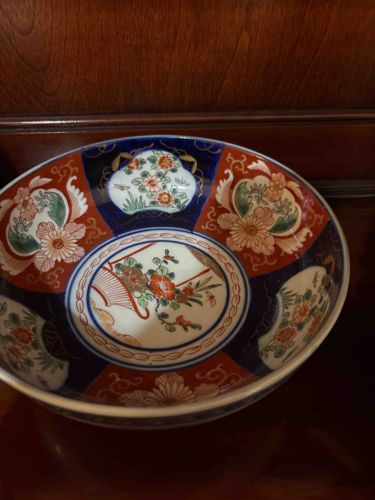 This is a circular porcelain bowl featuring a classic decorative scheme characteristic of Japanese Imari ware, produced in the Arita region. The piece showcases the traditional 'Imari' palette, which consists of underglaze cobalt blue, overglaze iron red, and touches of polychrome enamel alongside subtle gilding elements. The interior is divided into alternating radial panels of deep blue and reddish-orange, each containing cartouches. These cartouches are meticulously decorated with various botanical motifs, including chrysanthemums and peonies, which are common symbols in Japanese art. The central well of the bowl contains a circular medallion depicting a 'hanakago' or flower basket, surrounded by a double-ring geometric border in iron red. The construction is of fine hard-paste porcelain with a smooth, glazed finish. In terms of condition, the piece appears well-preserved with vibrant colors, though there are minor instances of wear on the overglaze enamels and gilding, consistent with age. There is a slight visible patina on the glaze surface, but no major chips, cracks, or structural repairs are immediately evident. This style of porcelain was extensively exported to Europe starting in the late 17th century; however, this specific bowl likely dates from the late 19th-century Meiji era (1868-1912) based on the saturation of the pigments and the density of the pattern. The craftsmanship illustrates high quality with consistent brushwork and a balanced composition typical of traditional Arita kilns.