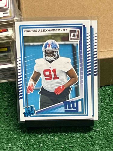 This is a modern sports trading card featuring Darius Alexander, a defensive tackle for the New York Giants. The card is part of the iconic 'Rated Rookie' subset from the Donruss brand produced by Panini. Measuring the standard 2.5 by 3.5 inches, the card is constructed from high-quality cardstock with a glossy finish. The design features a blue and white color scheme consistent with the Giants' franchise colors, with a multi-layered border and the vintage-style Donruss 'D' logo in the upper right. The player is pictured in a practice or training camp jersey (number 91) and helmet. Notable markings include the 'Rated Rookie' logo in the bottom left corner and the large Giants 'ny' logo at the bottom right. The centering appears slightly heavy toward the left side, but the corners and edges look sharp as it is housed in a protective clear plastic sleeve and a rigid top-loader. There is no visible sign of surface scratching, creasing, or edge wear in the current view. While this specific player is relatively obscure in the NFL collector circuit, the 'Rated Rookie' designation remains a highly sought-after brand hallmark for football enthusiasts and set builders.