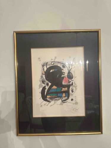 This item is a limited edition color lithograph by the renowned Spanish Surrealist artist Joan Miró. The artwork features Miró's signature abstract, biomophic style, characterized by a central black figure with a singular yellow eye and a geometric, colorful 'torso' composed of blue, yellow, and green squares. Splashes of coral pink and gray ink spatters surround the central motif, adding dynamic movement typical of his later career work (circa 1960s-1970s). The piece is printed on what appears to be heavy cream-toned wove paper. Notably, the work is hand-signed by the artist in pencil in the lower right-hand corner and features an edition number (likely X/200 or similar) in the lower left. The print is housed in a professional presentation frame consisting of a dark charcoal or black mat, a thin inner gold-tone fillet, and a broader outer gilt-wood or metallic gold frame. The craftsmanship of the print mirrors the high standards of established lithography studios such as Maeght. Physically, the paper shows slight toning consistent with age, though the colors remain vibrant. The frame exhibits minor surface scuffs, but the overall condition appears very good, with no visible foxing or water damage to the print itself.