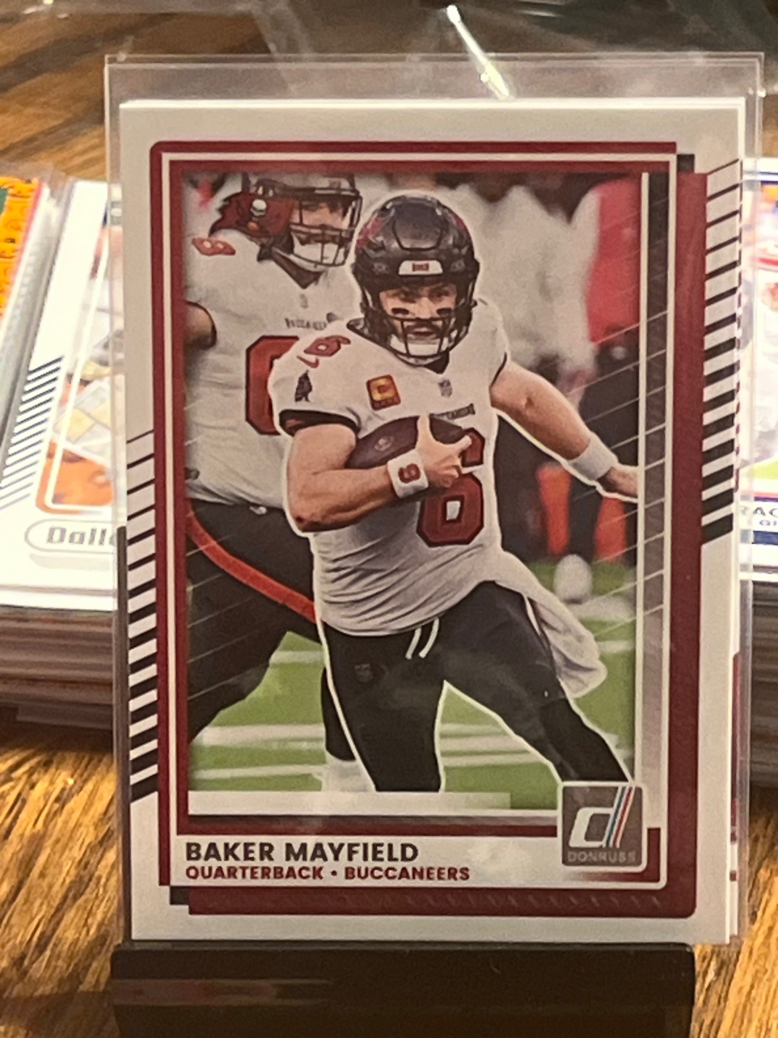 This is a 2023 Donruss trading card featuring Baker Mayfield in his Tampa Bay Buccaneers uniform. The card follows a classic Donruss design with a thick white border surrounding a primary action photo and a inner burgundy/maroon frame that complements the Buccaneers team colors. The main image depicts Mayfield in a dynamic running pose, carrying the football, wearing the team's white jersey and matte pewter helmet. The Donruss 'Rated Rookie' era logo is replaced here with the standard 'D' Donruss brand logo in the lower-right corner. Below the image, the text clearly states 'BAKER MAYFIELD' followed by 'QUARTERBACK • BUCCANEERS'. The card's aesthetic is defined by its clean, linear design elements, including diagonal hashes on the side borders. It appears to be a standard 2.5 x 3.5 inch card printed on glossy cardstock. Regarding condition, the card is currently housed in a clear protective penny sleeve. The centering appears slightly heavy toward the left side, though the corners seem sharp and the edges clean from this perspective. There are no immediate signs of surface scratches or creases visible through the sleeve, suggesting it is in near-mint to mint condition typical of modern collectibles.