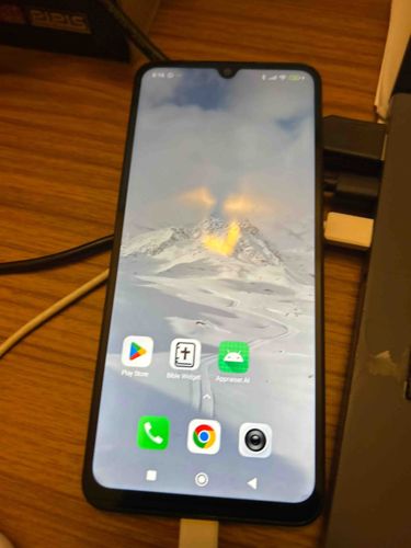 This is a Xiaomi Redmi 9 smartphone, a budget-friendly Android device released around 2020. The phone features a large 6.53-inch IPS LCD display with a noticeable 'teardrop' notch at the top housing the front-facing camera. The construction consists of a glass front with a plastic frame and back, characteristic of entry-level consumer electronics. This specific unit is shown in a black or dark grey finish. The screen is powered on, displaying a custom mountain landscape wallpaper and various application icons including the Google Play Store, Chrome, and a unique 'Appraiser AI' icon. Notably, there is a visible orange-tinted screen defect or 'burn-in/bleeding' mark appearing in the center of the display, which significantly impacts its aesthetic and functional condition. The external bezel shows minor signs of use, and a white charging cable is connected to the bottom port. The device represents modern mass-produced telecommunications technology designed for the global market, prioritizing high screen-to-body ratios and multi-camera functionality at an accessible price point.