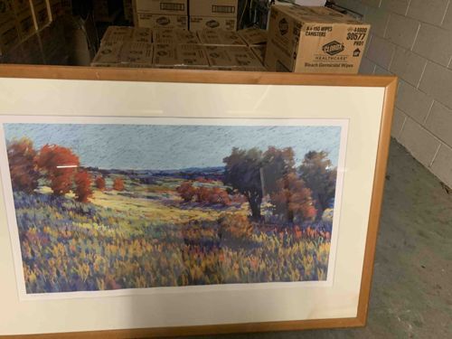 This item is a large-format landscape painting by artist Sadie Dahl, featuring a vibrant, Impressionist-style field scene. The composition depicts a rolling meadow transitioning into a distant horizon under a textured blue-grey sky. The work utilizes a rich palette of autumnal reds and oranges in the foliage, contrasted against yellow-green grasses and deep purplish-blue shadows. The medium appears to be pastel or oil pastel on paper, characterized by visible, energetic hatching and layered strokes that create a sense of movement. The piece is professionally mounted with a wide, off-white archival mat and housed in a contemporary, honey-toned natural wood frame with a simple flat profile. While specific dimensions are not provided, it appears to be a substantial exhibition-sized piece. The condition is overall excellent with the artwork protected by glass; however, there is a minor visible scuff or light reflection on the glass surface near the right-side trees. The frame shows no significant structural damage or corner separation. This contemporary piece represents high-quality craftsmanship in the regionalist landscape tradition, focusing on the atmospheric interplay of light and color.