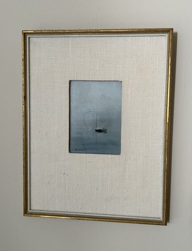 This is an original miniature oil painting by the renowned Cape Cod artist Anne Packard (American, b. 1933), likely dating to the late 1970s or 1980. The artwork measures approximately 4.5" x 3.25" and is housed in its original double-matted frame, which measures 11.5" x 9". The painting depicts a solitary sailboat adrift on a calm, misty sea, rendered in Packard’s signature atmospheric style with a palette of muted blues, greys, and soft whites. The brushwork is delicate yet expressive, capturing the quiet isolation and light of Provincetown. It is hand-signed 'A. Packard' in the lower-left corner of the image. The painting is presented in a deep-set frame featuring a thick linen-textured matting and a gilded gold-tone wood perimeter. The condition appears very good for its age, noting only minor age-appropriate wear and slight scuffing to the outer edges of the gold frame. The provenance is excellent, having remained with a single owner since its original purchase in Provincetown nearly 50 years ago. This piece exemplifies Packard’s ability to imbue small-scale work with vast spatial depth and emotional resonance, making it a quintessential example of her early-career seafaring coastal aesthetics.