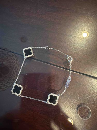 This jewelry item is a delicate chain bracelet featuring three distinct quatrefoil motifs, closely mirroring the iconic Alhambra design by Van Cleef & Arpels. The motifs are inlaid with what appears to be polished black onyx, bordered by a textured 'perlee' or beaded edge in a white metal, likely sterling silver or 18k white gold. The bracelet utilizes a fine trace chain construction with a secure lobster claw clasp and a small circular jump ring adjustment point. A rectangular metal hallmark tag is visible near the clasp, which is a standard feature for high-end designer jewelry or quality reproductions to denote metal purity and brand origin. The craftsmanship shows a high degree of symmetry in the clover motifs and consistent spacing along the chain. The black onyx inserts display a smooth, lustrous finish with no visible surface scratches or chips, while the white metal remains bright, suggesting minimal wear or recent professional polishing. The overall style is contemporary and sophisticated, embodying a minimalist aesthetic that remains highly sought after in modern luxury jewelry markets.
