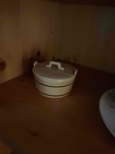 This item is a vintage ceramic lidded container designed to mimic the appearance of a traditional wooden barrel or butter tub. The piece is crafted from a light-colored earthenware or stoneware, featuring a creamy off-white or light tan glaze that covers both the body and the lid. The central body of the vessel is decorated with vertical indentations simulating wooden staves, held together by two horizontal darker bands, likely painted in a deep green or black, which represent metal or wood hoops. The lid is slightly recessed and features a molded rectangular handle, while two small tab-style handles extend upwards from the rim of the base, further emphasizing the bucket-like aesthetic. In terms of dimensions, the piece appears to be a medium-sized tabletop accessory, typically measuring between 4 to 6 inches in diameter. The craftsmanship shows a mid-20th-century aesthetic, common in American or European kitchenware from the 1940s to 1960s. While no manufacturer's mark is visible from this angle, the style is characteristic of firms like McCoy, Hull, or Red Wing. The condition appears stable with no major fractures or chips visible in the low-light photography, though there may be fine crazing typical of aged glazes. The vessel lacks prominent surface wear, suggesting it has been used primarily for display or stored in a protected environment like the wooden shelf shown.