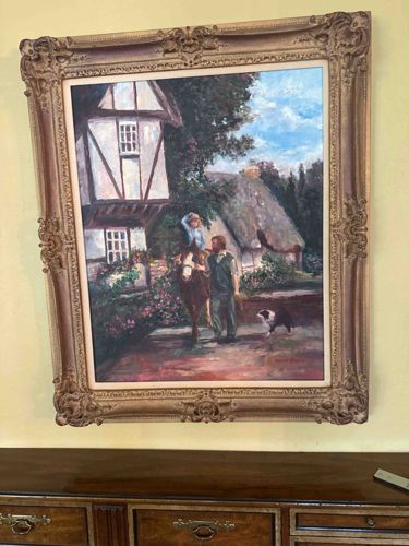 This is an original oil painting on canvas featuring a pastoral village scene, housed in an elaborate, Rococo-style gold-gilded frame. The composition depicts a tranquil rural setting with a prominent half-timbered Tudor-style cottage to the left and a thatched roof structure in the background. In the center, a man leads a horse carrying a young child, accompanied by a black and white dog, likely a border collie. The artwork is executed in an impressionistic style with visible, textured brushstrokes and a soft palette of earthy greens, browns, and whites, contrasted by a bright blue sky with scumbled white clouds. The painting is signed in the lower right corner, though the name is illegible from the image. The frame is a major feature, constructed of wood or composite with ornate gesso moldings, including floral scrolls and acanthus leaf motifs at the corners and centers. It shows a slightly aged gold patina with some evidence of dust in the deeper recesses of the carvings. The overall condition appears excellent with no visible surface cracking, paint loss, or sagging in the canvas. The aesthetic suggests a production period from the late 20th century, likely between 1970 and 1990, aiming to capture a nostalgic, European village charm. The quality of the hand-painted details suggests a professional artist, and the use of a linen fabric liner between the painting and the frame indicates high-end framing standards.