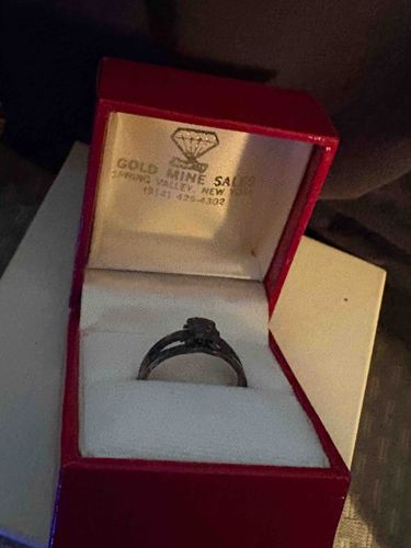 This item is a solitaire gemstone ring, likely an engagement ring, displayed inside a vintage red leatherette or textured paper presentation box. The ring features a split-shoulder shank design that tapers toward a central four-prong or six-prong setting. The metal of the band appears to have significant tarnishing or a dark patina, which may indicate it is silver-based or a low-karat white gold that has lost its rhodium plating. The central stone is approximately 0.25 to 0.50 carats, though clarity and exact type cannot be determined through the image. The box lid interior features a gold foil stamp from 'GOLD MINE SALES' located in Spring Valley, New York, including a diamond silhouette logo and a 914 area code telephone number. This suggests the piece likely dates from the late 20th century, specifically the 1980s or 1990s based on the typography and box style. The condition of the ring shows visible oxidation, while the box shows minor wear along the hinges and edges but remains structurally sound with a clean white satin and velvet interior.