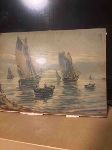 This rectangular artwork depicts a tranquil maritime scene featuring several traditional fishing luggers and smaller rowboats navigating calm coastal waters at what appears to be dawn or dusk. The palette is dominated by muted earth tones, blues, and pale yellows, creating a hazy, atmospheric effect. The central subjects are two larger gaff-rigged vessels with distinctive sails—one showing a circular emblem on its mainsail—accompanied by smaller dories, one of which has a visible figure rowing in the foreground. The piece appears to be executed on a flat substrate, likely paper or cardstock, and may be an original watercolor or a mid-20th-century lithographic print. Condition-wise, the work shows significant signs of age and wear. Most notably, there is prominent foxing (brown spotting) clustered in the upper center and right edges of the sky. The edges of the board show minor fraying and wear, and there is a circular glare on the surface indicating it may have a semi-gloss finish. A small, illegible signature or mark is visible in the bottom right corner. The style is reminiscent of early-to-mid 20th-century European maritime art, often produced for decorative domestic use. The lack of a frame suggests it has been removed from its original housing, exposing the vulnerable edges of the support material.