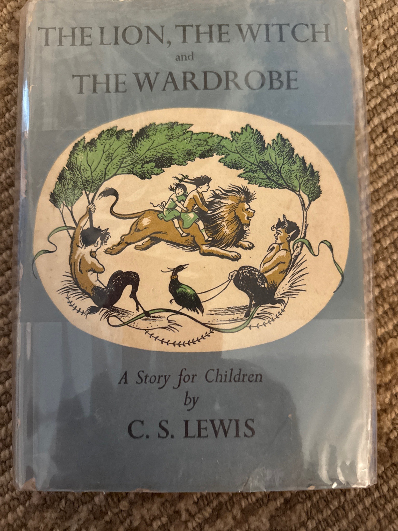 This is a vintage hardcover copy of 'The Lion, The Witch and The Wardrobe' by C.S. Lewis, which appears to be an early edition or a facsimile reproduction. The item features a light blue dust jacket with the iconic Pauline Baynes illustration in a central oval cartouche. The illustration depicts Aslan the lion with two children on his back, flanked by fauns and a stylized bird. The title and author’s name are printed in a classic serif black typeface. The book is protected by a secondary clear plastic Mylar-style sleeve. Physically, the dust jacket shows signs of age and wear; there is visible chipping and loss at the lower left corner and along the bottom edge, as well as minor shelf wear and light creasing along the top. The underlying paper shows some toning typical of mid-20th-century paper stock. The colors of the central illustration remain fairly vibrant, featuring hues of gold, green, and dark brown against a cream background. This specific design layout is characteristic of the original 1950 Geoffrey Bles publication, though a definitive identification of the printing would require inspection of the title page, copyright page, and the color of the internal cloth binding. The overall craftsmanship suggests a high-quality mid-century trade binding.