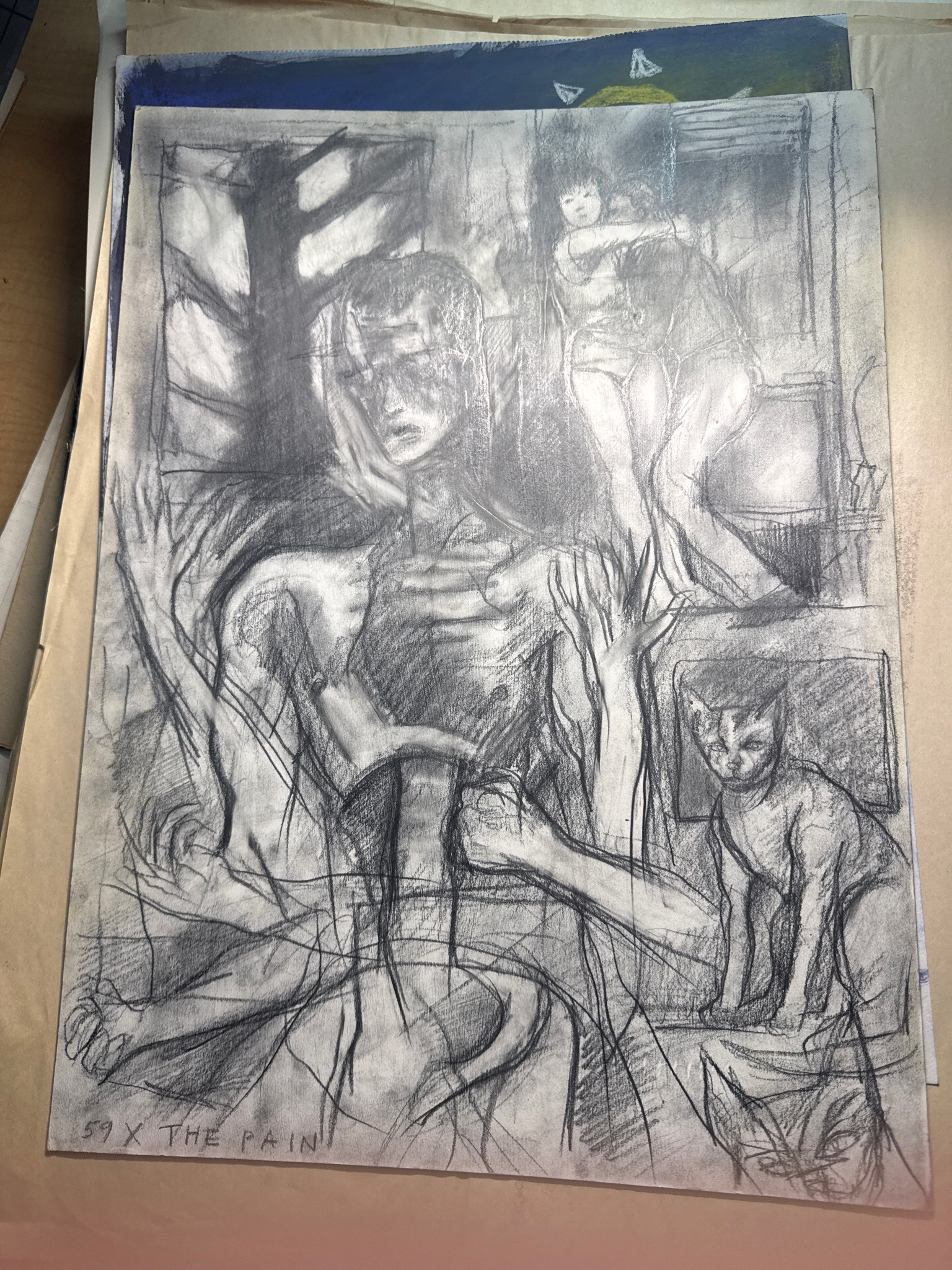 This is an original expressionist composition executed in charcoal and graphite on paper. The central focus is a distorted, skeletal male figure with multiple outstretched arms in a frantic or agonized gesture. In the upper right quadrant, there is a secondary scene of a couple embracing or dancing, while the lower right features a stylized cat. The work is titled '59 X THE PAIN' in the lower-left corner. The artist uses heavy smudging, energetic line work, and deep tenebrism to create a sense of psychological distress and movement. The paper appears to be a light-grey tone, possibly a heavyweight drawing paper or newsprint, though there are visible signs of wear including creasing along the edges, some corner blunting, and smudging inherent to the charcoal medium. The style is reminiscent of 20th-century figurative expressionism, emphasizing raw emotion over anatomical precision. The lack of a visible signature (beyond the title) suggests it may be a student work or a study from a contemporary artist's portfolio. The back of the sheet shows through slightly from the drawing underneath it in the stack, indicating a series of related studies.