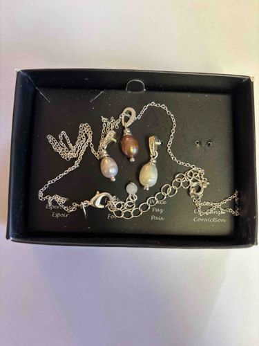This jewelry set features a delicate silver-toned cable chain, likely sterling silver or silver-plated base metal, accompanied by three interchangeable teardrop-shaped cultured freshwater pearl pendants. The pearls exhibit unique organic shapes and luster, coming in three distinct natural or treated shades: a creamy iridescent white, a soft lavender-pink, and a deep chocolate bronze. Each pearl is securely mounted with a silver-toned pin and capped with a decorative bail. The bails appear to be pavé-set with small colorless accent stones, likely cubic zirconia or crystals, adding a touch of brilliance. The necklace includes a lobster claw clasp and a generous extender chain for adjustable length, finishing with a small round bead at the end. The set is presented in its original black retailer's box, which features a commemorative or inspirational cardboard insert printed with words in multiple languages such as 'Espoir' (Hope), 'Paix' (Peace), and 'Conviction.' The items appear to be in excellent contemporary condition with no visible tarnishing, missing stones, or significant surface wear to the pearls' nacre. The craftsmanship is consistent with modern fashion or 'bridge' jewelry from the late 20th to early 21st century.