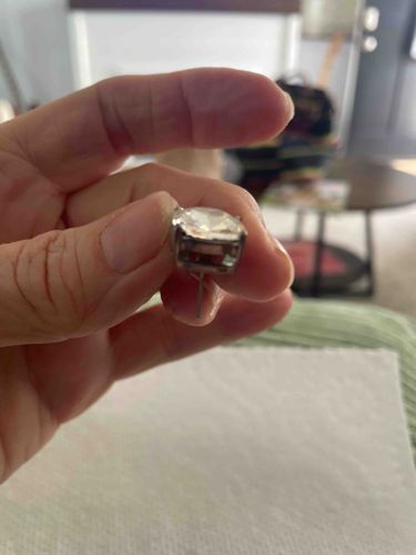 This item is a single solitaire stud earring featuring a large cushion-cut colorless stone, likely a cubic zirconia or a lab-created white sapphire given the scale and clarity visible. The stone exhibits a high-brilliance facet pattern characteristic of modern cutting techniques. It is securely mounted in a four-prong basket setting made of a silver-toned metal, which appears to be sterling silver or white gold-plated brass based on the surface sheen and slight darkening in the recessed areas. The construction is a standard post-and-nut style intended for pierced ears, though the friction back (butterfly nut) is not visible in the image. In terms of condition, the metal shows minor surface scratches and slight patina indicative of regular wear, while the stone appears intact without major chips or surface abrasions. No visible hallmark or maker's mark can be identified from this angle, though such stamps are typically located on the post or the side bar of the basket. The style is a contemporary classic, likely manufactured within the last 10-20 years. The craftsmanship is functional, using a standard industrial casting method common for fashion or fine-commercial jewelry collections.