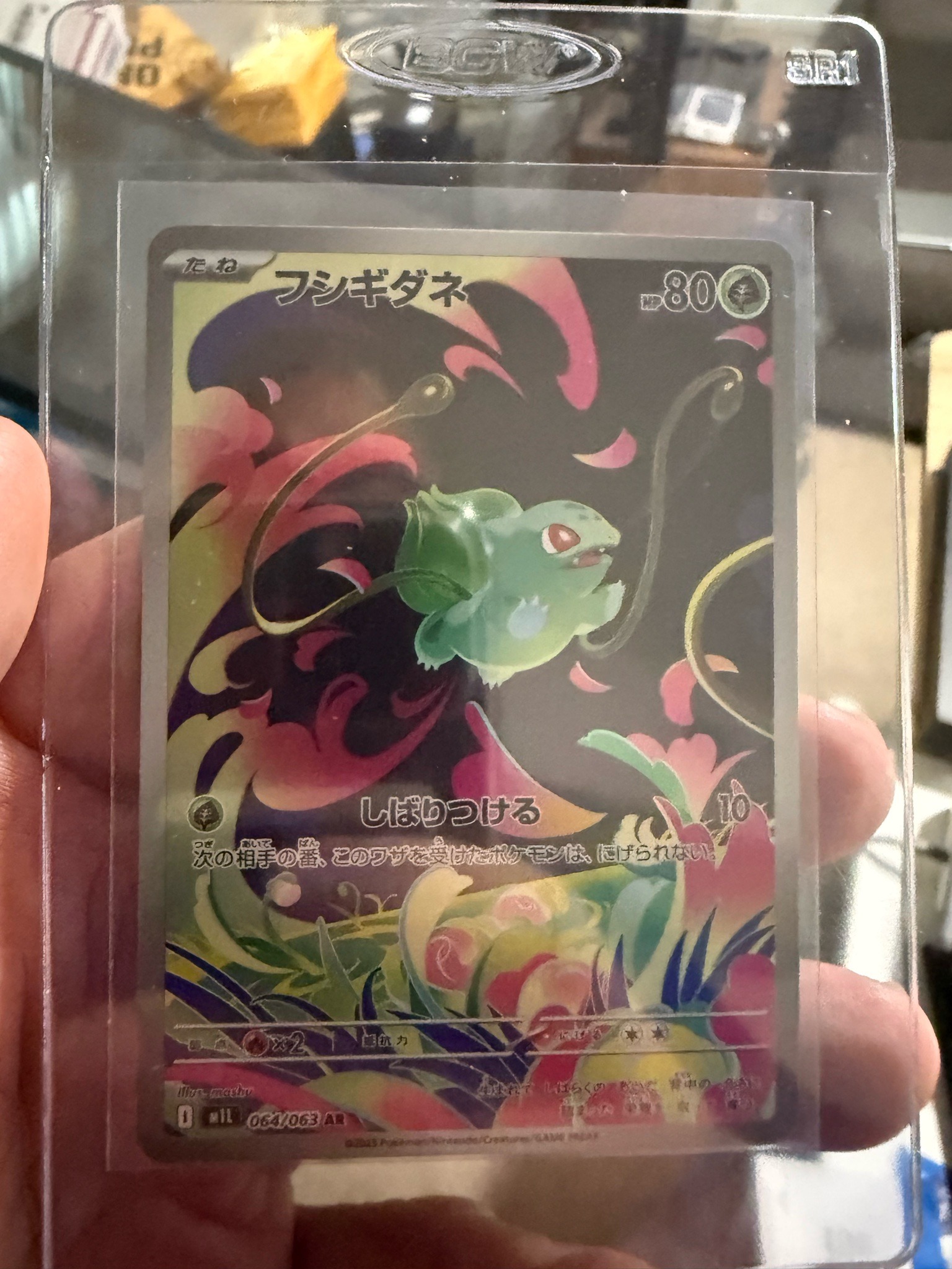 This is a Japanese-language Bulbasaur Art Rare (AR) card from the Pokémon Trading Card Game, specifically from the 'Pokémon Card 151' (sv2a) expansion released in 2023. The card features unique full-bleed artwork illustrated by 'mitsu', depicting Bulbasaur mid-air using its vine whips against a vibrant, stylized background of pink and purple floral patterns and dark shadows. Measuring approximately 2.5 by 3.5 inches, the card is printed on high-quality cardstock with a glossy finish and specialized holofoil etching characteristic of modern 'Art Rare' rarities. The card includes the Japanese name 'フシギダネ' at the top, an 80 HP stat, and a grass-type symbol. The bottom left identifies the set and number as '064/063 AR'. Physically, the card appears to be in Near Mint or Mint condition, currently housed in a transparent soft sleeve and a rigid 'BCW' semi-rigid card holder for protection. There are no visible surface scratches, whitening on the silver borders, or corner dings from the frontal view. The centering appears well-balanced. This card represents the modern 'Special Illustration' era of the hobby, highly sought after by collectors for its artistic value and short-print status within the iconic 151-themed set.