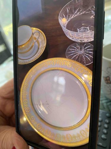 The primary item featured is a fine bone china bread and butter or salad plate characterized by a wide, cream or light porcelain-colored rim decorated with heavy gold encrusted gilding. The gilding displays an ornate, neoclassical etched motif consisting of repeating scrolls and oval patterns, bounded by thick gold bands on both the interior and exterior of the rim. Accompanying the plate is a matching demitasse or teacup and saucer, which repeats the same gilded pattern and high-glaze white porcelain body. The set appears to be from high-end American or European manufacturers, possibly Lenox or Minton, dating to the mid-to-late 20th century. The craftsmanship is high-quality, typical of fine dining formalware, featuring smooth glazing and crisp metallic application. Notably, the plate in the foreground exhibits a significant structural condition issue: a large, multi-directional star crack radiating from near the center, indicating impact damage. The surrounding crystal stemware features a cross-hatch 'diamond' and wedge cut pattern on the bowl and a matching star-cut base, evocative of classic Waterford 'Lismore' or similar luxury lead crystal patterns. The gold appears largely intact with minor surface micro-scratching, though the central crack on the plate severely impacts its utilitarian and market value.
