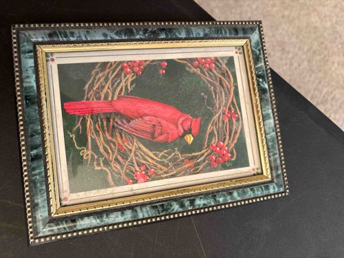 This rectangular art piece features a vibrant illustration of a Northern Cardinal bird, rendered in deep crimson and scarlet tones, nestled within a rustic twig wreath adorned with bright red berries. The artwork is set against a dark forest green background. The bird is depicted with significant detail in the feathers and a distinct yellow beak. The piece is housed in a decorative multi-layered frame consisting of a gold-toned inner rope-style molding, followed by a wide teal-and-black faux-marble or verdigris-effect cellulose/plastic insert, and finally an outer beaded metal rim. The artwork itself has thin black border lines and small decorative motifs in the corners of the white matting area. Physically, the item appears to be a vintage 20th-century decorative print, likely dating from the 1970s to 1990s based on the frame style. The condition shows minor superficial scratches on the frame's marbled surface and some slight dust accumulation, but no major structural damage or moisture staining is visible on the print. The craftsmanship indicates a mass-market decorative item rather than a bespoke fine art piece, though the color saturation remains high.