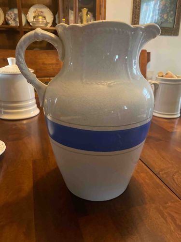 This is a large, vintage ceramic water pitcher, likely dating from the mid-20th century. Constructed from heavy-bodied white ironstone or earthenware, the pitcher features a classic utilitarian form with a wide, bulbous body tapering toward a stable base. The vessel is finished in a creamy white glaze characterized by significant all-over crazing, which is a network of fine cracks in the glaze layer indicative of age and moisture exposure. The decorative highlight is a thick, horizontal cobalt blue band encircling the midline, bordered by thin gold or metallic pinstripes that show signs of minor wear and fading. The pitcher features a ruffled or scalloped rim with beaded relief detailing along the edge and a large, ornate handle with twig-like or faux-bois texturing for enhanced grip. Based on the user-provided mark of 'Texas,' this likely refers to the 'Texas' pattern or maker associated with American ironstone producers from the 1940s-1960s. The overall condition shows signs of use and age, including the aforementioned crazing and some light surface staining typical of antique utility ware, but the structure appears sound without major visible chips or cracks in the primary image view.
