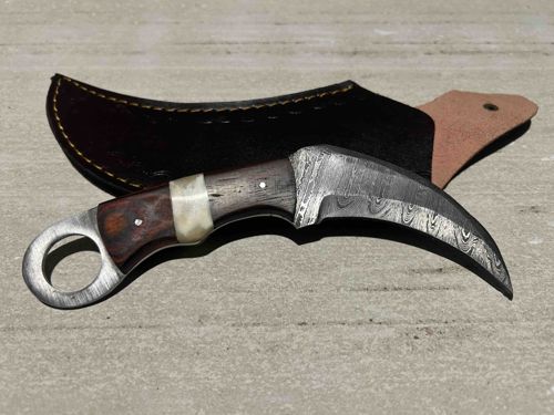 8” karambit style fixed blade knife. Handle is made of wood and bull bone