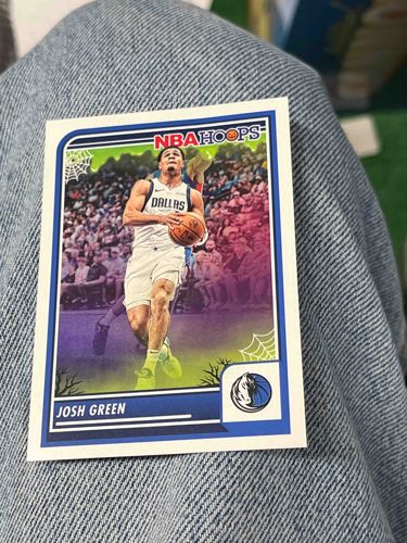 This is a standard-sized modern basketball trading card featuring player Josh Green of the Dallas Mavericks. The card is part of the 2021-22 Panini NBA Hoops collection, specifically the Halloween-themed subset frequently distributed in trick-or-treat packs. It is constructed from cardstock with a glossy finish. The design features a white border surrounding a blue inner frame. The imagery includes Josh Green in a white Dallas Mavericks jersey handling a basketball against a crowd background. Distinguishing 'Halloween' elements include lime green and purple gradient hues over the image, spiderweb graphics in the upper left and lower right corners, and silhouettes of bare branches/trees near the bottom. The player name is printed at the bottom left in white against a blue banner, and the Dallas Mavericks logo is positioned at the bottom right. The condition appears to be excellent upon visual inspection, with sharp corners and clean edges visible in the photograph, though value is contingent on the centering and surface quality. This modern sportscard represents the late 2010s to early 2020s era of card collecting, characterized by specialized seasonal parallels and high-resolution photography.
