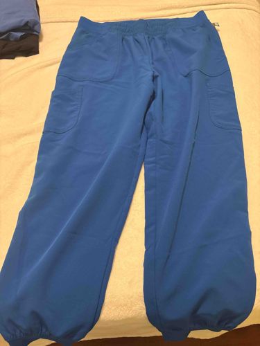 A pair of contemporary medical scrub pants in a vibrant royal blue color. The garment is constructed from a synthetic performance fabric blend, common in modern healthcare apparel for its moisture-wicking and wrinkle-resistant properties. The design features a mid-to-high rise elasticized waistband with vertical decorative stitching, indicating a secure pull-on fit. Functional utility is highlighted by multiple pockets: two deep front slash pockets and two lateral cargo-style pockets located on the outer thighs. The silhouette is a modern 'jogger' style, distinguished by elasticized gathered cuffs at the ankles. The construction exhibits industrial-grade stitching, specifically reinforced at stress points like the pocket openings. Condition appears excellent with no visible pilling, fading, or structural failures such as frayed seams or holes. The fabric maintains a clean, pressed appearance without significant wrinkling. While a specific brand tag is partially visible on the back waistband, the exact manufacturer is not clearly legible, though the style is consistent with high-end modern scrub brands like FIGS or Grey's Anatomy. This item represents modern professional healthcare attire designed for both comfort and utility.
