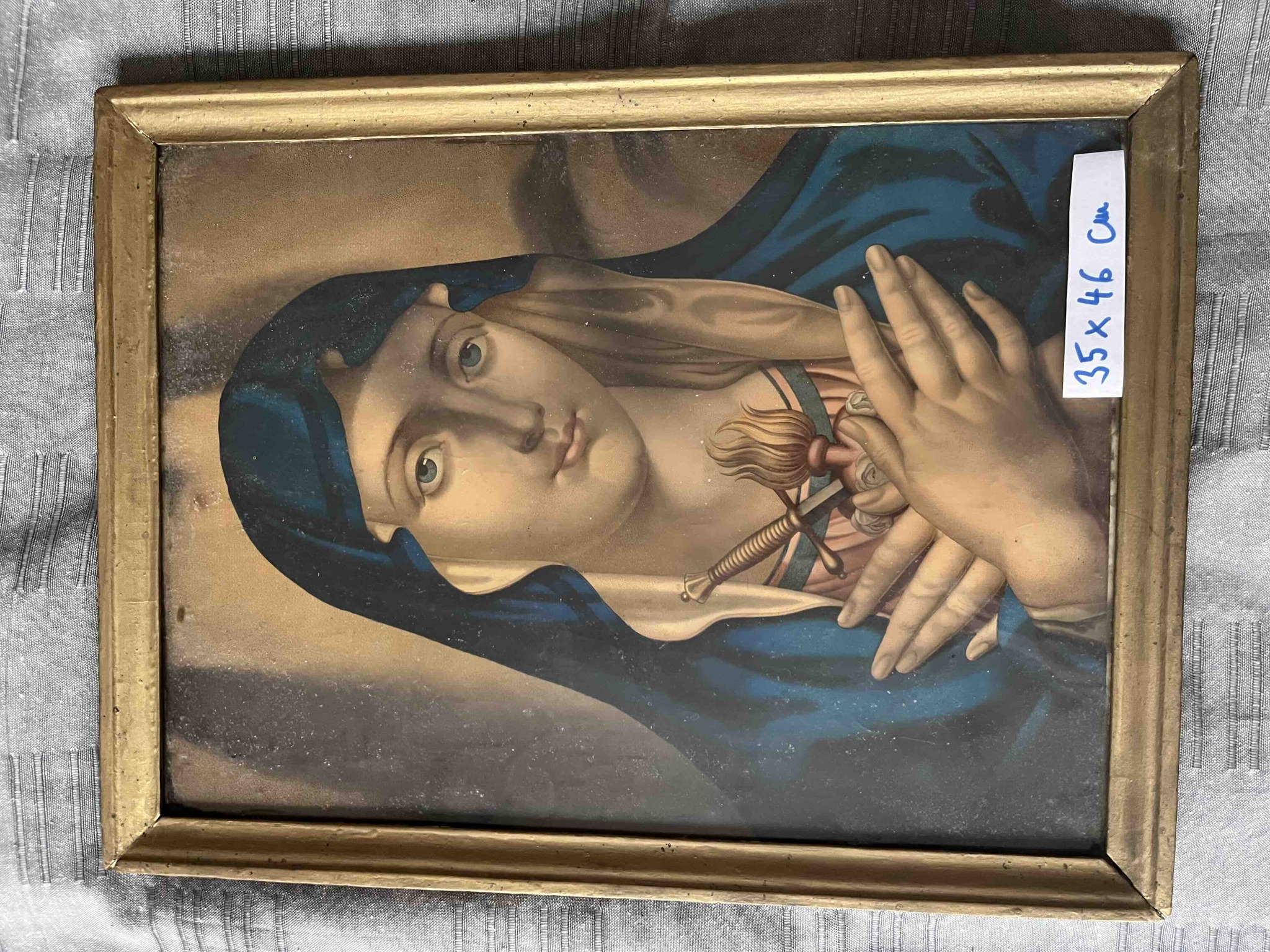 This item is a traditional religious 2D artwork depicting the 'Mater Dolorosa' or Our Lady of Sorrows, characterized by the symbolic sword (dagger) piercing the Immaculate Heart. Measuring approximately 35x46 cm as indicated by the scale marker, the piece appears to be a mid-20th-century color lithograph or offset print on paper or thin board. The central figure is shown with a deep cerulean blue hood over a tan veil, both hands folded over a flaming heart surrounded by white roses. The artistic style mimics Neoclassical or late Renaissance portraiture with soft, blended transitions in skin tones and dramatic, somber lighting. The heart is prominently featured with a detailed golden hilt on the piercing sword. The artwork is housed in a simple, mitered wooden frame with a faded gold or gilt finish, showing significant abrasions, oxidation, and loss of the metallic finish at the corners. The image surface exhibits several condition issues, including visible dust accumulation, faint moisture spotting or foxing across the lower half, and some potential color fading from light exposure. There are no obvious maker's signatures visible in the photograph, suggesting a mass-produced devotional item rather than a unique fine art painting. The overall craftsmanship of the frame is utilitarian, typical of mid-century religious decor.
