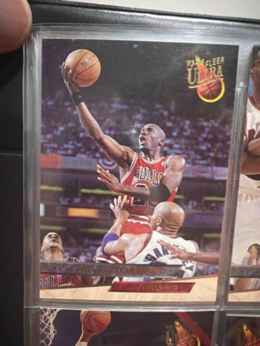 This is a 1993-94 Fleer Ultra Michael Jordan basketball trading card, featuring the Chicago Bulls superstar in an iconic mid-air layup sequence against the Phoenix Suns. The card is a standard 2.5 by 3.5 inches, printed on premium high-gloss cardstock which was a hallmark of the 'Ultra' brand during this era. The front features a full-bleed action photo with the '93-94 Fleer Ultra logo in the upper right corner, stamped in gold foil. Jordan’s name is prominently displayed at the bottom in gold foil lettering against a marble-textured banner. The photography showcases intense detail, capturing the muscles and expression of the athlete. In terms of condition, the card is currently housed in a plastic protective binder sleeve. Based on the visual, there appear to be minor surface scratches on the protective plastic that may or may not affect the card underneath. The centering looks slightly heavy toward the right margin. The corners appear relatively sharp through the sleeve, though professional grading would be required for a definitive state. This card represents a peak period in NBA history, released just as Jordan was transitioning into his first retirement, making it a staple for 1990s sports memorabilia collectors.