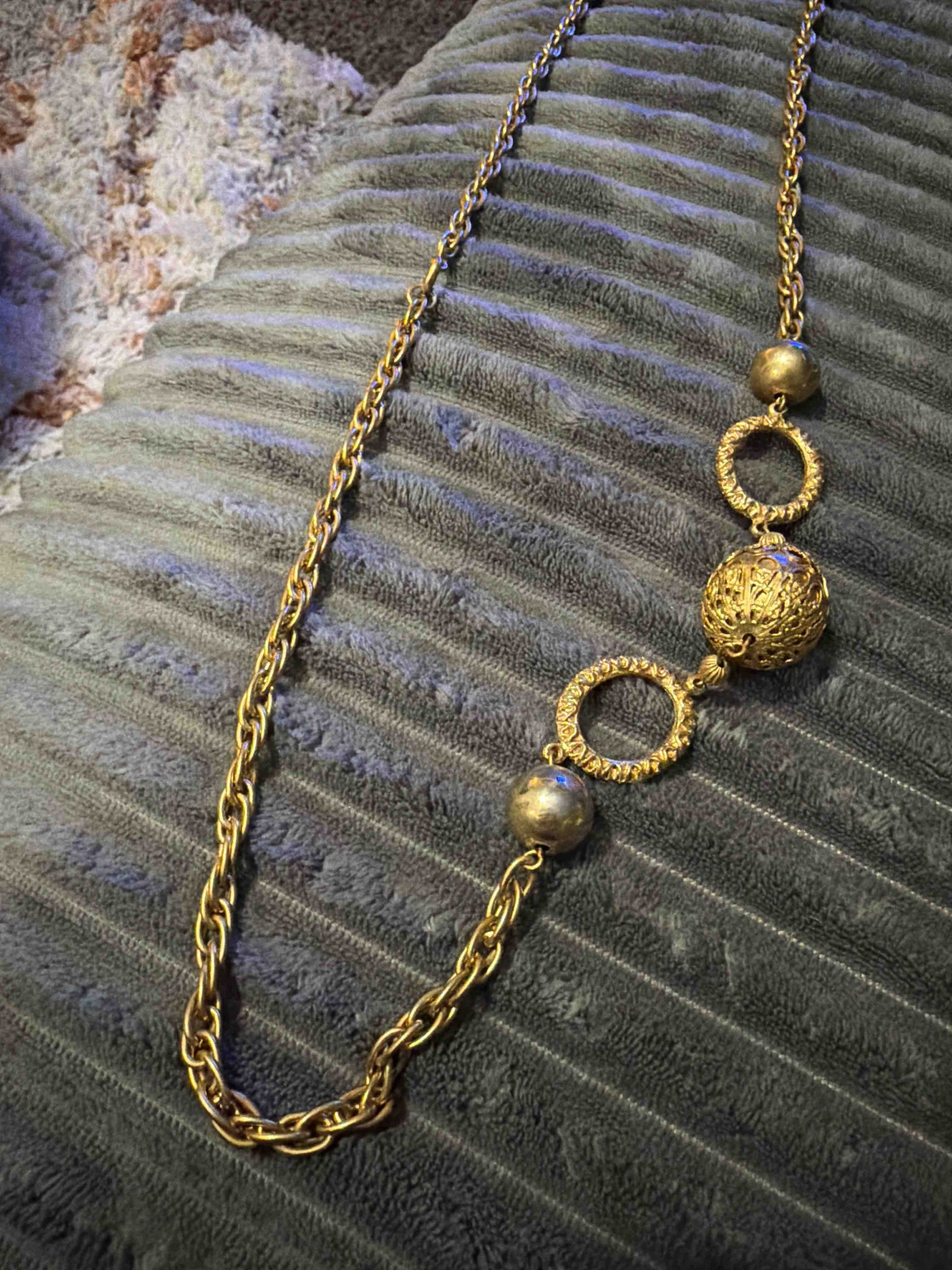 This is an elongated, opera-length costume jewelry necklace featuring multiple distinct design elements integrated into a single continuous chain. The primary structure is a thick, gold-tone dual-link or curb-style chain with a bright, lustrous finish. The focal point of the piece is an asymmetrical arrangement of decorative elements, including two smooth polished spheres, two textured open-circle rings, and a large, intricate central filigree sphere. The filigree orb showcases fine lace-like metalwork with scroll motifs, suggesting a vintage aesthetic commonly found in mid-20th-century costume jewelry (likely 1960s-1970s). The materials appear to be gold-plated base metal, evidenced by the slight variation in color and patina across the different components. The textured rings feature a repeating geometric or floral pattern, providing a stylistic contrast to the smooth polished beads. In terms of condition, there is visible surface wear and minor oxidation or tarnish on the smoother spheres and links, consistent with age and use. No clear maker's marks are visible in the provided image, though the weight of the links and the complexity of the filigree suggest a higher-quality costume piece from a manufacturer such as Trifari, Monet, or Napier. The construction uses jump rings to connect the larger ornamental segments to the main chain, indicating a modular design approach.