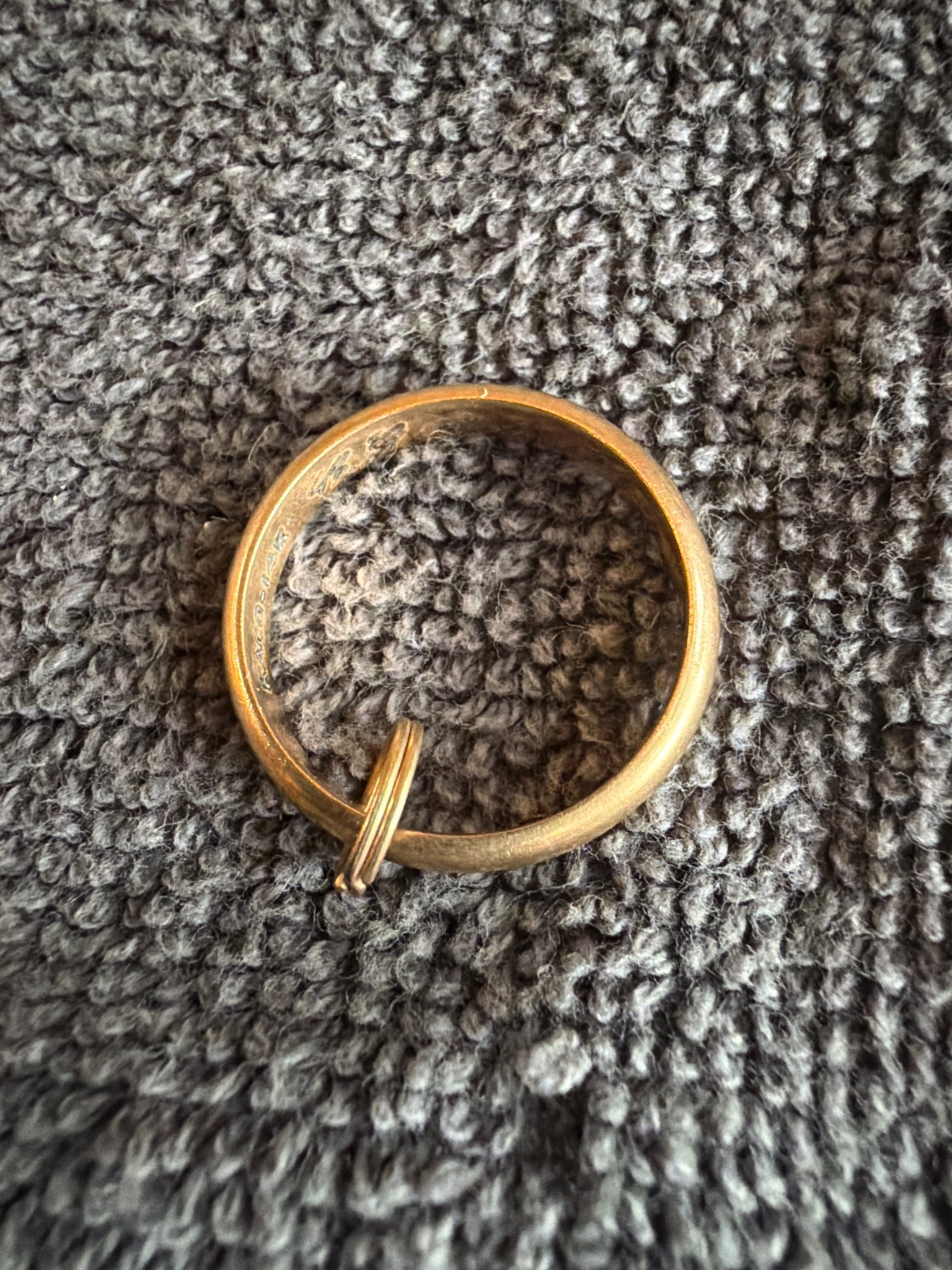 This item is a classic high-polish yellow gold wedding band, likely of mid-20th-century manufacture. Based on the hallmark visible on the interior of the shank, it appears to be marked '14K', contradicting the provided context of 24k. The hallmark also includes a partial maker's mark that resembles 'BACO.' The ring features a rounded, low-dome profile and is currently equipped with a metal ring guard (size adjuster) at the base of the shank. This guard is used to temporarily reduce the interior diameter for a tighter fit without permanent resizing. Physically, the gold displays a rich, warm yellow hue consistent with traditional alloys. The condition shows moderate surface wear, including a fine network of micro-scratches and minor dings consistent with regular long-term use, creating a soft patina. There is a small notch visible above the ring guard, which may indicate a previous repair point or a deep nick in the metal. The craftsmanship appears solid and machine-finished, typical of reliable commercial jewelry production from the 1950s through the 1970s. Its weight and simple geometric design suggest a focus on durability and timeless style.