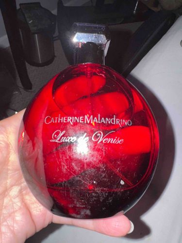 This item is a spherical glass fragrance bottle containing Catherine Malandrino's 'Luxe de Venise' Eau de Parfum. The bottle is crafted from a deep, translucent ruby red glass, giving it a bold and luxurious appearance. The primary text on the face of the bottle features the brand name 'CATHERINE MALANDRINO' in a clean, sans-serif uppercase font, positioned above the fragrance name 'Luxe de Venise' written in a contrasting elegant script. The bottle is topped with a faceted, clear acrylic or glass cap that sits upon a black neck assembly, intended to mimic the appearance of a gemstone. In terms of condition, the front surface of the bottle shows significant visible wear, including numerous fine surface scratches, scuffs, and a somewhat dull patina likely caused by friction or improper storage. There are some light white residue marks visible on the lower half of the sphere. The liquid volume appears nearly full, suggesting the item has been minimally used. This fragrance belongs to the contemporary designer perfume market, likely manufactured within the last ten years, following Malandrino's expansion into lifestyle and beauty products. The craftsmanship of the bottle is typical of commercial designer fragrances, focusing on impactful visual design and bold color palettes to convey a sense of elegance and drama.