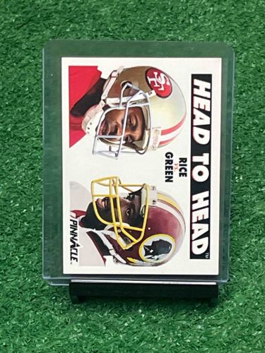 This is a 1992 Pinnacle 'Head to Head' series football trading card featuring Hall of Famers Jerry Rice of the San Francisco 49ers and Darrell Green of the Washington Redskins. The card measures 2.5 by 3.5 inches and is constructed from glossy cardstock typical of the early 1990s Pinnacle brand. The layout is horizontal, showcasing two close-up profile shots of the players in their respective helmets. Jerry Rice is pictured at the top in his gold 49ers helmet against a red band, while Darrell Green is shown below in his deep burgundy Redskins helmet with its distinctive yellow facemask against a white background. The text 'HEAD TO HEAD' is printed vertically in a bold, black sans-serif font on the right side. The Pinnacle logo is visible in the bottom left corner. The card is currently housed in a clear plastic top-loader for protection. While the image shows the card in good visual condition, the centering appears slightly shifted toward the top-right border. The corners appear relatively sharp through the plastic casing, with no immediate evidence of creasing or surface scratching, though microscopic edge wear is common for this era and brand. This card represents the high-gloss aesthetic that defined the premium sports card market during the early 1990s.