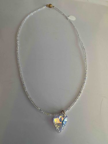 This jewelry piece is a princess-length necklace featuring a strand of small, faceted clear crystals leading to a prominent heart-shaped lead glass crystal pendant. The pendant exhibits the signature Swarovski 'Aurora Borealis' (AB) coating, which creates a shimmering, multi-colored prismatic effect reflecting blues, yellows, and pinks. The heart is suspended by a metallic bale, which, based on provided context, is composed of 14-karat gold. The strand appears to be made of uniform bicone or round faceted crystal beads, likely also by Swarovski, strung on a flexible wire or thread. Near the clasp, a small oval metal hang-tag is visible, a common feature for authenticating luxury costume jewelry brands. The closure appears to be a spherical magnetic or lobster-style clasp with a matte gold-tone finish. Condition -wise, the crystals appear to be in good vintage condition with high clarity and no visible major chips or fractures to the facets of the main heart. The metal components show a slight matte patina consistent with age but no significant tarnish or structural damage. This style is consistent with late 20th-century Swarovski designs, specifically the 1990s through early 2000s, known for high-quality precision cutting and the use of precious metal findings to elevate their crystal components.