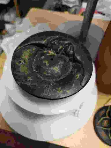 This item is a heavy, industrial-style cast iron utility tool, likely a tobacco press or specialty herb grinder, dating from the late 19th to mid-20th century. Constructed from solid cast iron with a dark, oxidized finish, it features a circular base plate and a top compression disk. The physical color is a mottled charcoal grey and black, exhibiting a heavy natural patina consistent with age and use. There are visible traces of green oxidation or mineral deposits on the surface, which may indicate exposure to moisture or botanical residues over time. The item shows significant surface wear, including minor pitting and texture variations typical of old forging processes. A distinguishing feature is a faint, raised character—possibly an 'A' or a manufacturer's mark—cast into the lower portion of the central disk. The craftsmanship is utilitarian and robust, designed for high-pressure manual tasks. The handle assembly extending from the top suggests a lever-action or screw-down mechanism for compression. Its condition is aged, with no immediate signs of structural cracks, but it requires cleaning and conservation to prevent further surface corrosion.