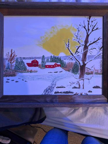 This item is a framed landscape painting depicting a serene winter scene. The medium appears to be acrylic or oil on a flat substrate, possibly canvas board or heavy paper. The composition features two vibrant red barn-like buildings set within a snow-covered field, flanked by evergreen trees and a prominent leafless deciduous tree in the foreground. A large, stylized yellow sun or glow dominates the upper center of the horizon, transitioning into a pale blue sky. The level of detail and brushwork suggests it is a piece of folk art or amateur hobbyist work, characterized by flat perspective and simplified geometric forms. The painting is housed in a dark brown, rustic wooden frame with visible wood grain and mitered corners. Physically, the item shows some signs of its handmade nature, including visible brushstrokes and an uneven application of paint in the sky area. No artist signature or date is immediately visible in the lower corners. The overall condition appears stable, though there is a Slight shadow or discoloration across the bottom center and right of the frame, likely due to lighting in the photograph rather than a defect in the object itself. The style is reminiscent of late 20th-century Americana or primitive regionalist art.