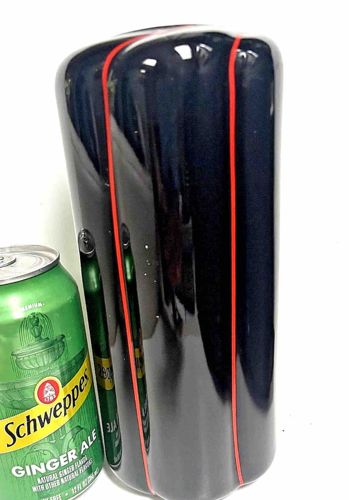 This is a vintage Japanese ceramic vase produced by Seizan. The item features a tall, cylindrical form with a distinct lobed or fluted body, standing approximately twice the height of a standard 12oz soda can shown for scale. The primary glaze is a deep, high-gloss cobalt blue that appears almost black in certain lighting, characteristic of high-quality Japanese porcelain exports from the mid-to-late 20th century. A striking design feature is the inclusion of thin, vertical red pinstripes that follow the recesses of the fluted edges, providing a sharp geometric contrast. The construction shows precise molding and uniform glaze application. Based on the 'Seizan Japan' attribution, this piece likely dates to the 1960s or 1970s and reflects the Mid-Century Modern influence on Japanese decorative arts. The surface appears to be in good vintage condition with a reflective sheen, though there is a visible small white fleck or glaze skip on the left-side center that may be a manufacturing imperfection or a minor surface nick. No significant cracks or large chips are immediately apparent. The craftsmanship indicates a commercial but high-quality kiln production, emphasizing sleek lines and minimalist aesthetics typical of the 'Japan' marked wares meant for international markets.