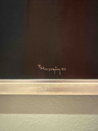 This item is an original painting, likely oil or acrylic on canvas, featuring a deep, dark composition with vertical tonal shifts in brown and black. The artwork is notably signed in the lower center with the artist's name 'T. Hafström' followed by the date '83' in a stylized, elongated script that features distinctive descenders on several letters. The paint application appears smooth with subtle vertical brushstrokes or textures visible under localized lighting. The piece is housed in a contemporary silver-toned or metallic-finish frame with a stepped profile, which indicates a late 20th-century aesthetic consistent with the 1983 production date. In terms of condition, there are visible vertical scuff marks or surface abrasions just above the signature area that break through the dark pigment, which may affect the overall valuation. The Swedish surname suggests the artist Jan Thomas Hafström (known as Thomas Hafström), whose work often explores minimalist or abstract themes. The craftsmanship exhibits a professional level of finish typical of mid-to-late 20th-century Scandinavian modernism.