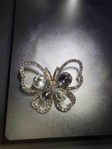 This decorative fashioned brooch is designed in the shape of a butterfly, featuring a gold-toned metal base, likely a zinc alloy or similar base metal. The piece is heavily embellished with clear, faceted synthetic stones, most likely glass or acrylic rhinestones. The central body and inner wings are defined by four large, teardrop-shaped or 'pear-cut' stones that radiate from a small round central stone. The outer perimeter of the four wings is traced with a single row of small PAVÉ-set round-cut rhinestones, creating a shimmering outline. Two polished gold-toned antennae extend from the top of the body. The craftsmanship is typical of contemporary mass-produced costume jewelry, utilizing glue-in settings rather than traditional prong-set high jewelry techniques. In terms of condition, the item appears to be in good used condition with all stones present; however, microscopic surface scratches on the larger stones and minor tarnishing on the metal underside (not fully visible) should be expected. This style is reflective of modern fast-fashion accessories from the late 20th to 21st century, designed for maximum sparkle and aesthetic appeal at an accessible price point.