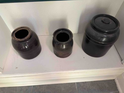 This set of three antique stoneware storage crocks consists of various sizes and shapes typically used for preserving foods such as butter, lard, or preserved vegetables. The vessels are crafted from heavy, dense stoneware clay. The largest crock on the right features a deep dark brown to black Albany slip glaze, common in the mid-to-late 19th century, and includes a matching fitted lid with a central knob handle. It has a cylindrical body with a slightly tapered shoulder. The two smaller crocks to the left exhibit variations in glaze, likely a mixture of salt-glazing and iron-rich slip, resulting in deep chocolate and earthy brown tones with a characteristic 'orange peel' texture on the far-left piece. Each has a thick, reinforced rim designed for securing cloth or waxed paper covers with twine. The middle crock shows significant surface wear and potential lime or salt deposits near the base, while the far-left crock displays minor chipping around the inner lip. These pieces represent American utilitarian pottery from the period of 1860-1890, showcasing handmade craftsmanship evident in the slight irregularities of their forms. No manufacturer marks are visible from this top-down perspective, but their robust construction indicates they were intended for heavy daily use.