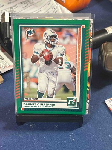 This is a modern era trading card featuring quarterback Daunte Culpepper during his tenure with the Miami Dolphins. The card is a 2017 Donruss Football release, specifically recognized by the classic Donruss 'D' logo in the bottom right corner. Its most notable feature is the 'Press Proof' designation printed in the lower-left area of the frame, indicating it is an insert or parallel version rather than a standard base card. The card features a vibrant green border, which is a specific color parallel typically found in retail or hobby packs. Physically, the card is standard 2.5 x 3.5 inches and appears to be constructed of glossy coated cardstock. The imagery shows Culpepper in his white Dolphins jersey, dropping back to pass. Regarding condition, the card is housed in a protective clear plastic top-loader sleeve, which helps preserve its integrity. The centering appears slightly heavy toward the left side, though the corners and edges visible through the sleeve seem crisp with no obvious fraying or whitening. The green ink remains saturated and bright. This item represents a nostalgic look back at a prominent 2000s-era athlete through a 2017 retrospective set design, reflecting high-quality modern offset lithography printing techniques.