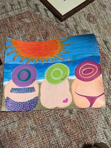 This is an original naive or outsider-style painting executed on a flat, rectangular substrate, likely heavy paper or cardstock. The composition depicts a whimsical beach scene featuring three sunbathing figures viewed from behind. The figures are rendered with exaggerated, rounded forms and are wearing vibrant sun hats in shades of purple, lime green, and fuchsia. The central figure is nude with a small pink heart detail on the hip, while the flanking figures wear patterned and solid-colored swimwear. The hats contain handwritten cursive text which appears to read 'Sunny', 'Beach', and 'Bum'. The background consists of a bright blue sky, a large stylized orange sun with radiating rays, and a deep blue ocean with small sailboats on the horizon. The sandy foreground appears to have a textured or glittered application to mimic the appearance of sand. The colors are bold, saturated, and applied with visible brushwork, suggesting an amateur or folk-art aesthetic. No visible signature is apparent on the front, and the piece shows slight curling at the edges, indicating it is unframed. The overall condition appears fair with no major tearing, though the edges are varied. The style is contemporary and decorative.
