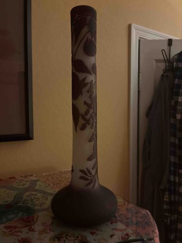 This is an elongated 'solifleur' or stick-neck vase crafted in the signature Art Nouveau style of Émile Gallé. The vessel features a bulbous, low-slung base that tapers sharply into a tall, slender cylindrical neck. It is constructed from multi-layered cased glass, utilizing the acid-etching technique to create a cameo effect. The ground consists of a translucent frosted white/grey glass, providing a high-contrast backdrop for the dark mahogany or deep Burgundy-toned glass overlay. The decorative motif consists of acid-etched botanical elements, likely leaves and berries, that climb the length of the neck with varying depth. The craftsmanship suggests a production date circa 1900-1920. While the lighting in the image is dim, the vase appears to be in good structural condition with no major chips or cracks visible on the rim or base. The surface shows a matte finish characteristic of frosted cameo glass from this period. Authenticity would be further confirmed by a relief-etched 'Gallé' signature, typically found integrated into the foliage or near the base. The piece exhibits the organic, nature-inspired fluid lines quintessential to the Nancy School of French glassmaking.