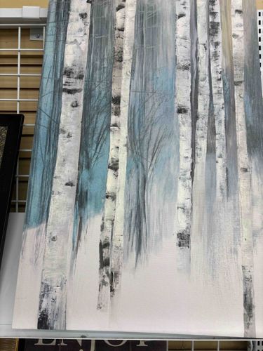 This item is a decorative wall art piece depicting a vertical scene of white birch or aspen trees against a cool-toned background. The work is executed in a contemporary, semi-abstract style with a palette consisting primarily of white, various shades of gray, charcoal, and soft cerulean blue. The composition focuses on the textural elements of the tree bark, utilizing high-contrast black markings (lenticels) against the white trunks to create visual rhythm. The background suggests a misty or snowy environment through vertical brushstrokes and diffused color washes that emulate a winter atmosphere. Construction appears to be a digital giclée print on a textured synthetic canvas, rather than a hand-painted original oil or acrylic, which is characteristic of modern mass-produced home decor. The piece is a 'gallery wrap,' meaning the canvas is stretched over a hidden wooden internal frame with the image continuing around the edges, requiring no external decorative frame. There are no visible artist signatures or maker's marks on the front surface. The condition appears to be excellent with no signs of UV fading, warping of the wooden frame, or abrasions to the canvas surface. Based on the style and typical retail environment, this item likely dates between 2015 and the present day and is intended for commercial or residential interior design.